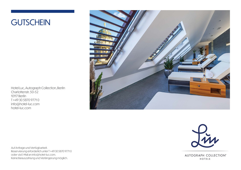 Gönnen Sie sich oder Ihren Liebsten eine Auszeit vom Alltag und erleben Sie tiefste Entspannung im exklusiven CitySpa Well-being Suite des Hotel Luc. Mit einem Wertgutschein für unsere luxuriösen Massagen schenken Sie nicht nur Wohlbefinden, sondern ein unvergessliches Erlebnis für Körper und Geist.